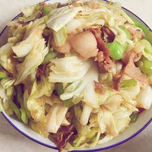 加入撕好的包菜,开大火,等包菜炒到有点透明了加入酱油,醋,翻炒,然后放入青椒继续翻炒