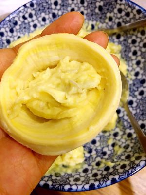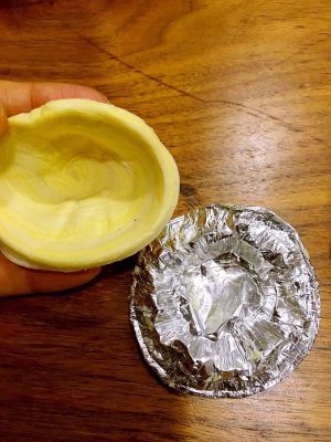 将冷冻的蛋挞皮室温软化20分钟,把锡纸壳取掉。