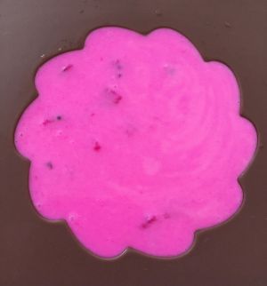 准备一个可露丽硅胶模,倒入有果肉的红色慕斯液,冰箱冷冻半个小时