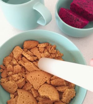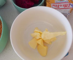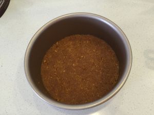 黄油隔水加热液化,加入饼干碎内,拌匀