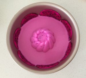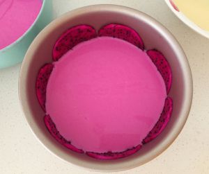 取1/4的火龙果切片,切好的火龙果片紧贴住模具内部,整齐沾好,冰箱冷冻半小时