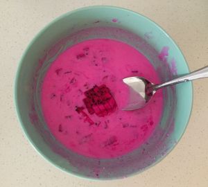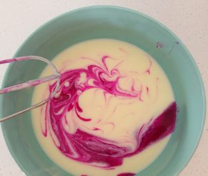 红肉火龙果3/4切小块,取小部分炸出汁备用。取1/3的慕斯液加入红肉火龙果汁,拌匀