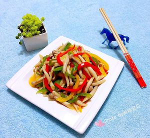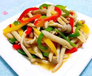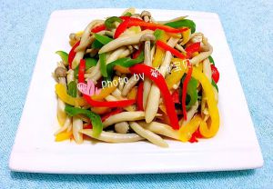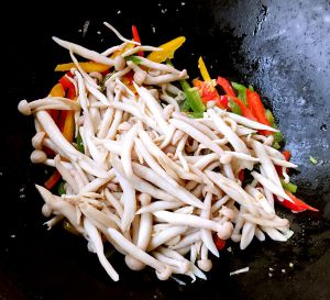 再放入焯好的茶树菇放入盐炒匀最后放入味精提鲜即可