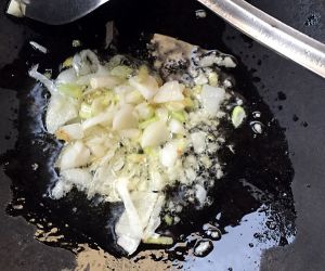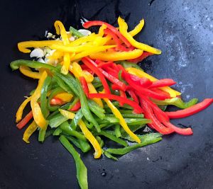 葱姜蒜末爆香后放入彩椒大火爆炒