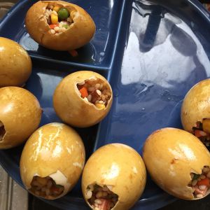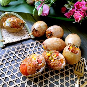 把腌好的糯米馅填入鸭蛋中,八九分满
