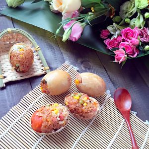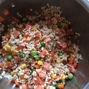 火腿肠切丁、胡萝卜切丁、玉米粒洗净、青豆焯水