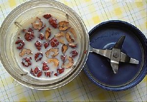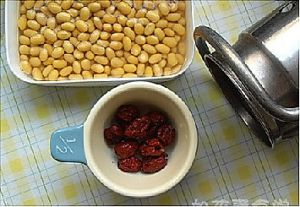 纯豆浆加上剪碎的小红枣粒,用料理机或豆浆机的搅打功能打匀即可。