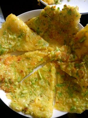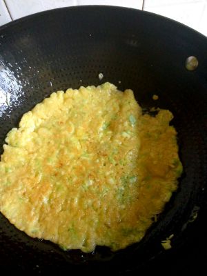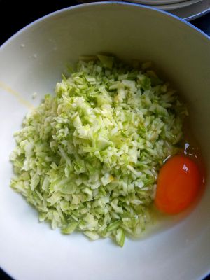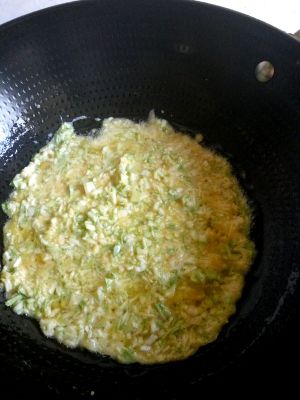 把西葫芦先切成细丝,再切成小粒,放入鸡蛋,也可以放些其它自己喜欢吃的。