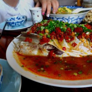 鱼头蒸熟后,撒上葱花,淋上热油,就大功告成了。