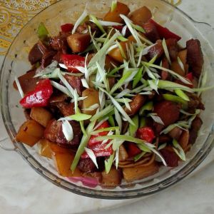 随后放青椒红椒翻炒几遍,出锅时放葱丝即可~