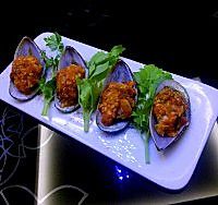取出青口贝,饰以欧芹和黑胡椒粉装盘。
