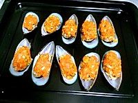 将青口贝向上放置于浅烤盘上,将揉合成团的混合材料分成小块覆盖在青囗贝上,烤箱250度,5分钟左右。