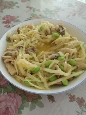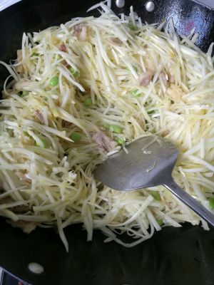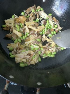 肉丝炒熟后加豆子跟金针菇