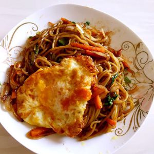 青菜洋葱胡萝卜下锅炒,炒至断生,放入面,加入酱油,盐,