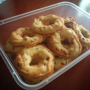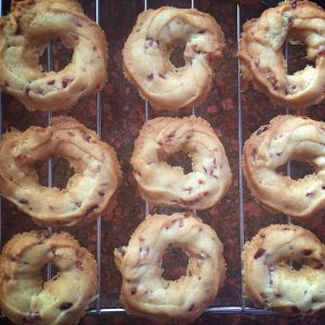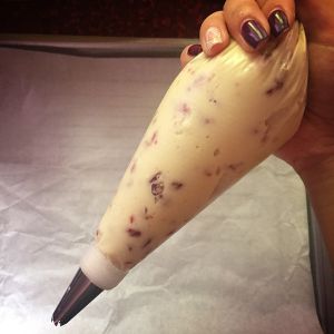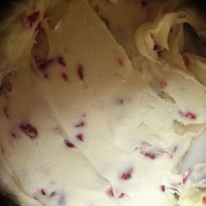 黄油软化后加入少许盐,分三次加入糖粉打发。在打发的黄油中加入淡奶油搅拌至完全吸收。筛入低粉,用刮刀将低粉混合均匀。蔓越梅干切成小块后倒入面糊搅拌(切细一点,以免后续堵住裱花嘴)。这时候可以开始预热烤箱,上下管170度,10分钟。