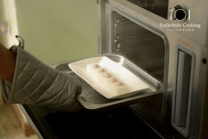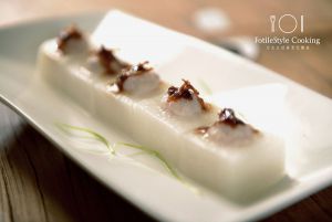 在白萝卜块的凹槽中填入自制的酱汁,将萝卜块移入蒸箱中,设置蔬菜模式,12分钟,蒸至萝卜用筷子可以插入。