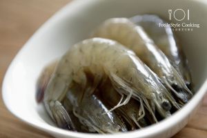 取6只鲜虾,剥去虾壳,切成细丝。