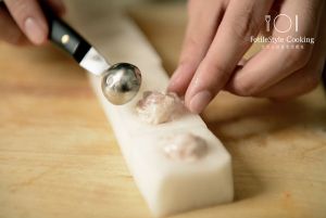 白萝卜去皮,清洗干净,切成6cm见方的块,用冰激凌勺或小勺在每块白萝卜块的中间挖出一个凹槽。