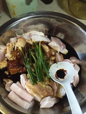 腌制五花肉,我是前一天晚上腌制的,调料的量按照肉的分量来加,我加了图中的勺子的量,生抽老抽各2勺,再适量的盐,用手拌匀后,放冰箱冷藏待用就可以了。