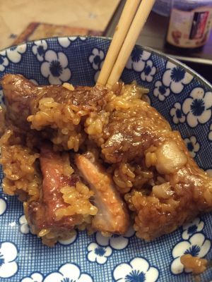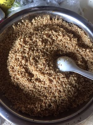 这是第二天浸活水的米,米浸好后,把水沥干,开始加料,生抽老抽各2勺(图中勺子的量),盐适量。拌匀等待1小时后,米入味了再用。这段时间你可以准备其他的东西。