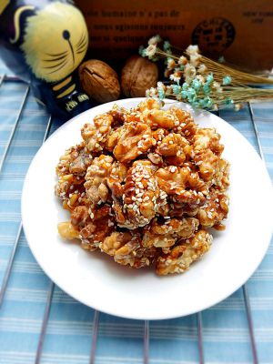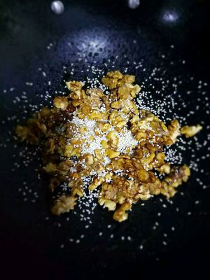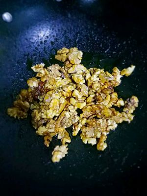 熬好后迅速加入核桃仁快速翻拌均匀。