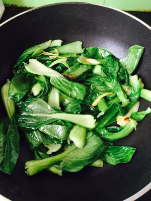 锅内再次加入少许油,放入切好的葱姜丝爆香,然后放入青菜翻炒