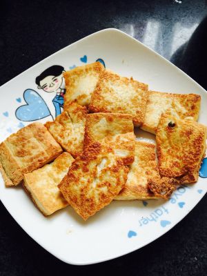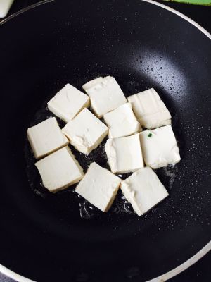 锅内入油,依次从锅边缘滑入打好的豆腐,煎制两面金黄盛出备用