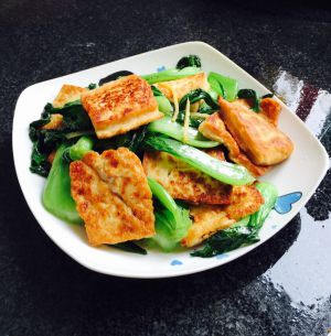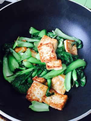 青菜炒软加入豆腐,放盐,鸡精调味,如果干锅可以加点水