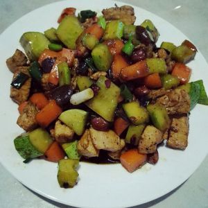 锅内少量油,倒入切好的鸡肉丁翻炒,炒到发白,盛出