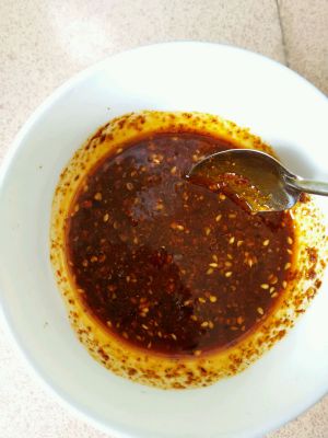 取一个小碗,将酱油、醋、盐、辣椒油、花椒油、香油搅拌均匀。