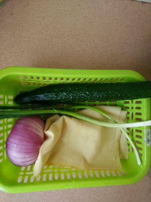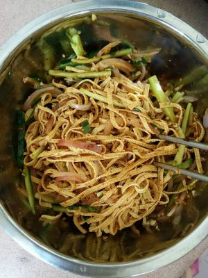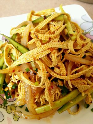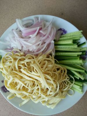 过好凉开水的豆腐皮洋葱丝沥干水装入大碗,加入青瓜丝,上面码上葱花蒜蓉。