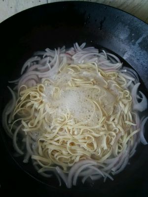 锅里烧开水,加两滴食用油,下豆腐丝洋葱丝大火焯几秒钟。