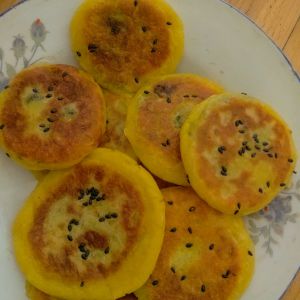 抓一小团压扁包上麻蓉陷,两面按压做成饼的形状,平底锅烧热放进去煎到两面金黄。