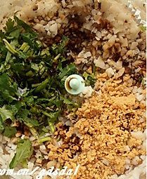 藕、香菇用碎菜器打碎+砸碎的花生末;加入所有调味料和匀;