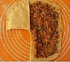 将发酵好的面团揉匀稍醒擀成面片;馅料填在面片上,其中左下角不空出来;