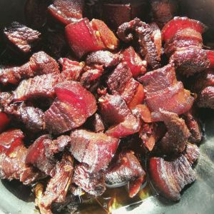 翻炒大约四十秒 再次放入一半生姜片 一大半花椒 八角 继续翻炒