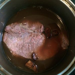 牛肉放进锅里,慢火煮5分钟,再浸泡约2小时。让牛肉收缩一下,里面的水份排出,牛肉变的紧致。
