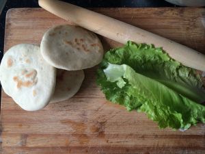 平底锅小火烧得微微发热时 放入面饼 盖上盖 记住一定是小火 不需要放油 大概一分钟后翻面 干烙成小饼鼓起有了厚度 两面有了虎皮纹就好了