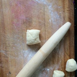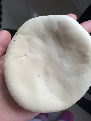 面团揉圆后 用擀面杖擀成饼状 不要太薄