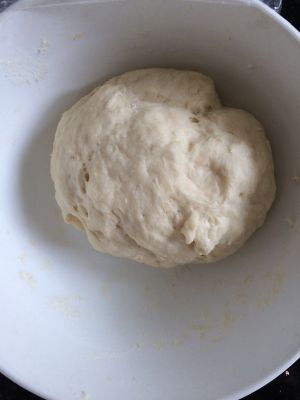 面粉里加2克盐混合 然后倒入加入2克酵母融化后的温水(谈到水的问题,其实可以先加入少许开水 再用温水和匀的,或者直接用温水都可以)揉几分钟成光滑的面团 盖上湿布或者保鲜膜醒发至两倍大,因为我是早上做 所以我提前晚上揉好放入冰箱冷藏发酵一晚