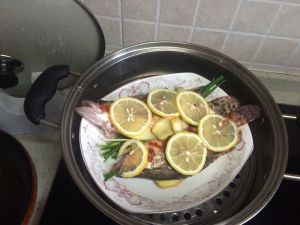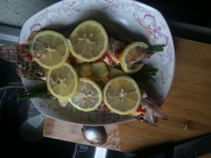 放上切片的柠檬片(半只),捏住剩下的把汁淋在鱼身上。