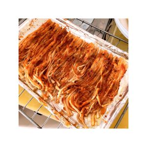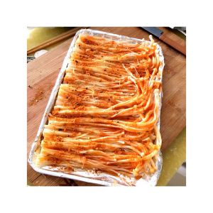 将金针菇洗净,控出水,撕成小条条铺平在烤盘上