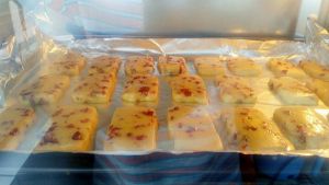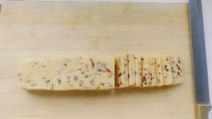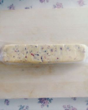 7 放入冰箱冷冻室,冷冻一个小时左右,冻得稍微结实点儿,要不然会一切就碎。一小时后,拿出来,切成0.5cm厚薄片。动作要快,如果天气热,黄油容易融化,就切不了整齐的饼干片了,边角会碎。