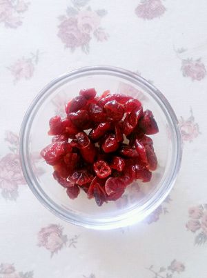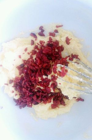 5 加入蛋液和糖粉,面粉,继续搅拌,最后再把剁碎的蔓越莓干放入,搅拌均匀。