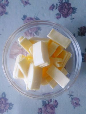 2 提前把黄油从冰箱拿出,切成薄片,室温下软化,20分钟左右,不用化得太过。