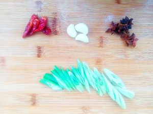 取半根葱,3-4瓣蒜,4-5个辣椒,将葱切成大段,蒜拍碎,辣椒切开,这样能能好的入味