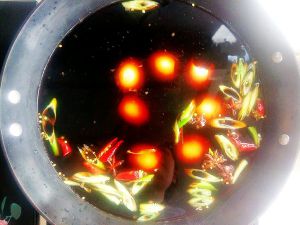 将锅中换上干净的水,把剥好的鸡蛋和之前备好的调料都放到锅中,可以根据个人口味加入适量的盐、糖和酱油