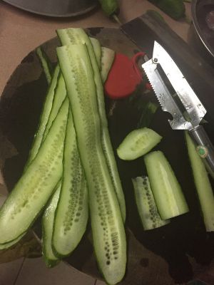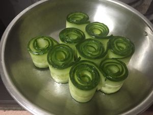 黄瓜用刮皮器划片。此步骤真正要选好刮皮器。