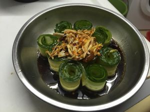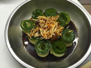 佐料放入黄瓜面上,热锅烧热油浇上。OK,成品出炉!