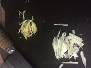 姜蒜切碎。我不能吃蒜,所以我切丝。加入干辣椒,我选用重庆干辣椒。用盐腌制片刻。
